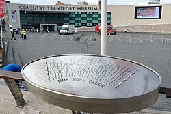 The control panel of the Time Zone Clock in front of Coventry Transport Museum